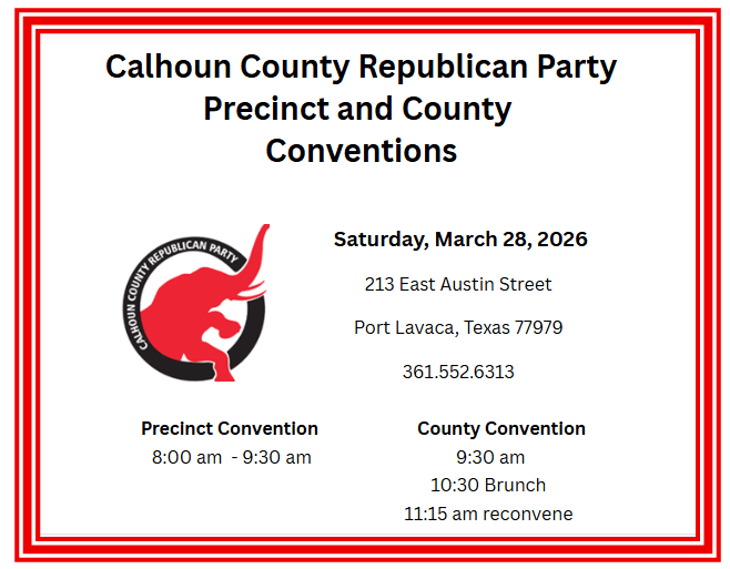 The Calhoun County Republican Party Canvass Committee will meet on Thursday, March 12, 2026 at 8 am to canvass the March 3, 2026 Primary Election Results. Canvass will take place at the Republican Party Headquarters located at 2025 State Highway 35N, Port Lavaca, Texas.